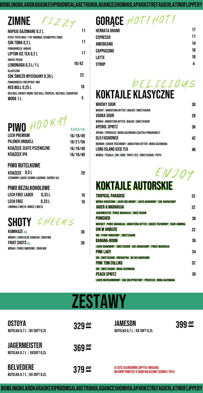 HULAKULA mamy aż trzy karty, które oferują wyjątkowe smaki na każdą okazję! Oprócz KARTY PIZZY, znajdziesz również MENU DLA DZIECI, pełne pysznych i prostych dań idealnych dla najmłodszych, oraz MENU GŁÓWNE HULAKULA, które zachwyci Cię nie tylko daniami głównymi, ale także szeroką ofertą drinków i napojów – od kreatywnych koktajli, takich jak TROPICAL PARADISE czy JAGER & MARAKUJA, po klasyczne napoje, piwa i soczki, które idealnie uzupełnią każdy posiłek i sprawią, że wizyta w HULAKULA będzie pełna smakowitych wrażeń. Sprawdź co dla Ciebie przygotowaliśmy: